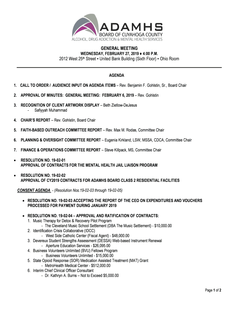 GENERAL MEETING WEDNESDAY, FEBRUARY 27, 2019 4:00 P.M.2012 West 25th Street United Bank Building (Sixth Floor) Ohio Room AGENDA 1. CALL TO ORDER / AUDIENCE INPUT ON AGENDA ITEMS Rev. Benjamin F. Johnston,