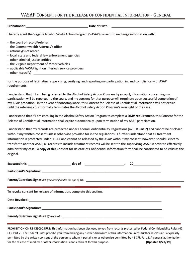 ASAP CONSENT FOR THE RELEASE OF CONFIDENTIAL INFORMATION GENERAL Probationer: Date of Birth: I hereby grant the Virginia Alcohol Safety Action Program (ASAP) consent to exchange information with: