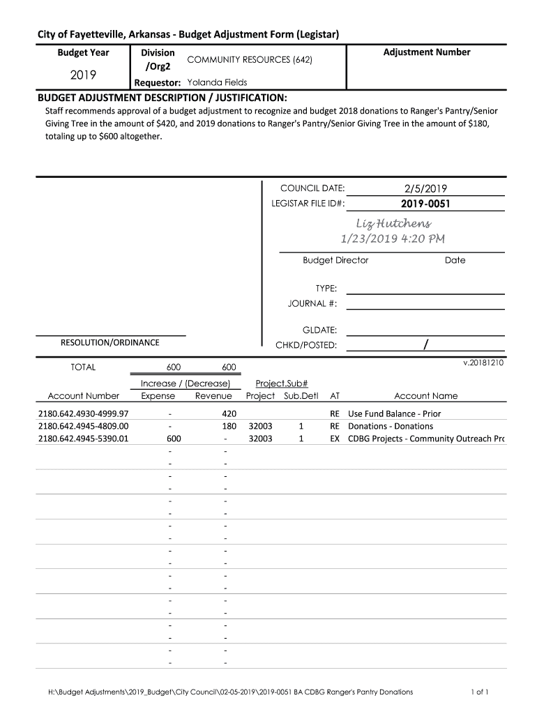 City of Fayetteville, Arkansas Budget Adjustment Form (Register) Budget Year2019Division /Org2Adjustment NumberCOMMUNITY RESOURCES (642)Requestor: Yolanda FieldsBUDGET ADJUSTMENT DESCRIPTION / JUSTIFICATION: