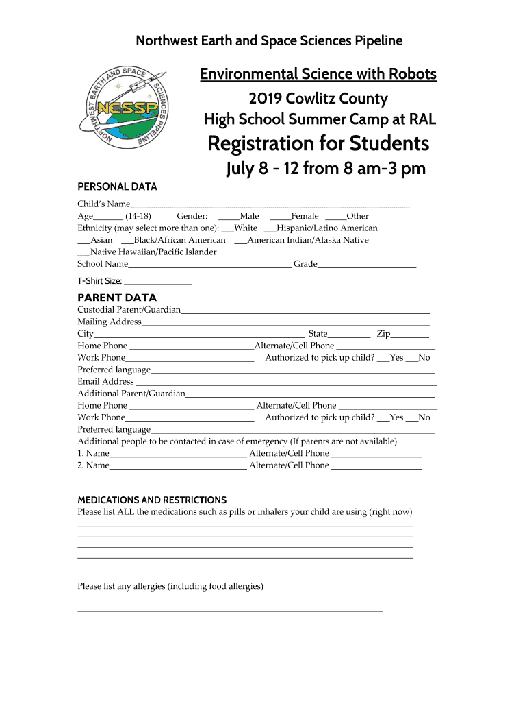 Northwest Earth and Space Sciences Pipeline Environmental Science with Robots 2019 Cowling County High School Summer Camp at Registration for Students July 8 12 from 8 am3 impersonal DATA Child's