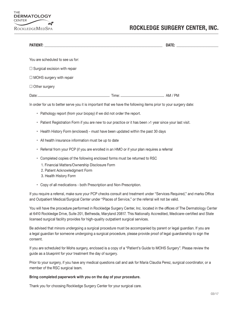 ROUTLEDGE SURGERY CENTER, INC. PATIENT:DATE: You are scheduled to see us for: Surgical excision with repair MOSS surgery with repair Other surgery Date:Time:AM / PM In order for us to better serve