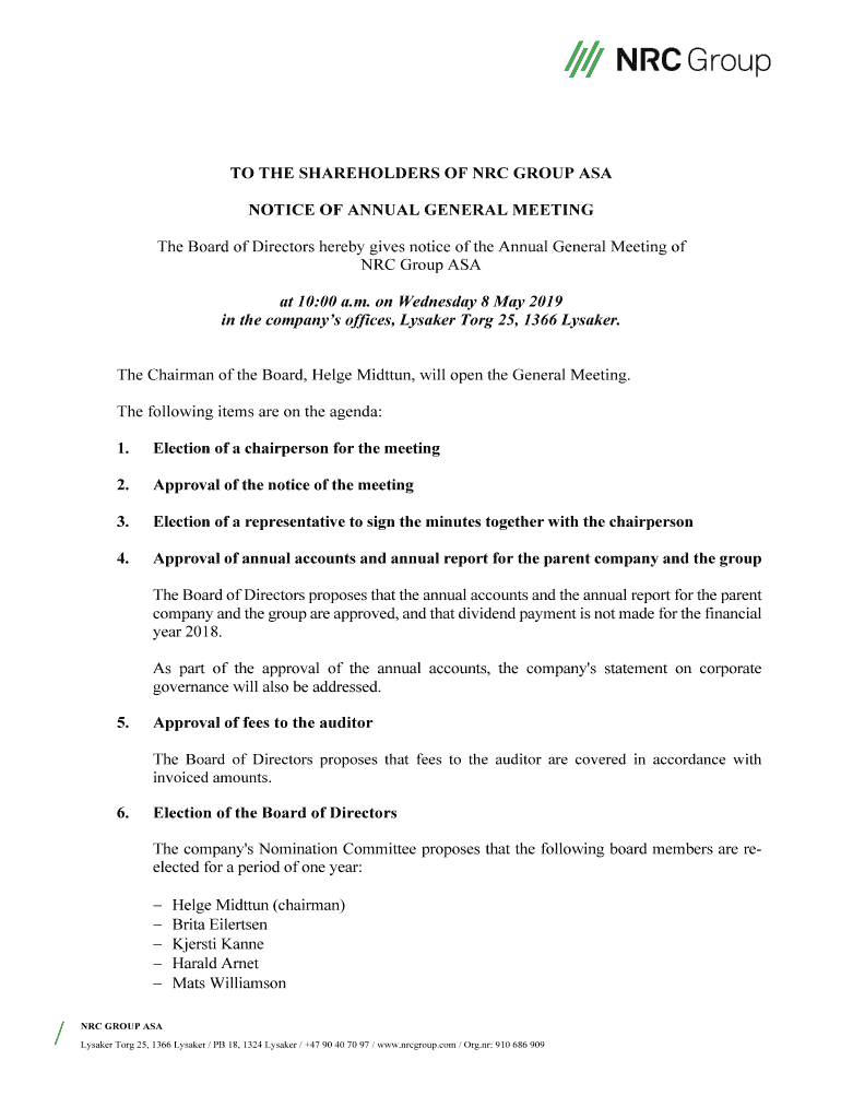 TO THE SHAREHOLDERS OF NRC GROUP ASA
