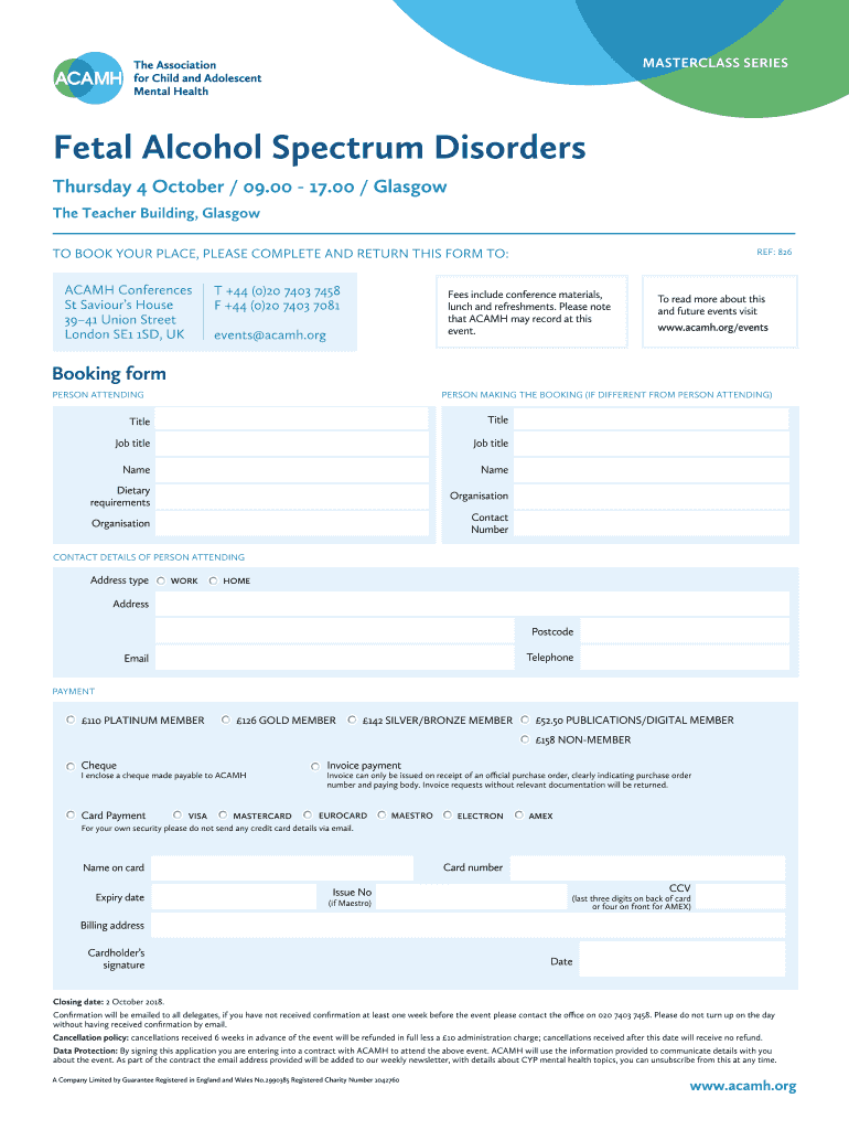 Official AC AMH certification for delegates6 hours Fetal Alcohol Spectrum Disorders CPD Thursday 4 October / 09.00 17.00 / Glasgow The Teacher Building, Glasgow This event aims to raise awareness