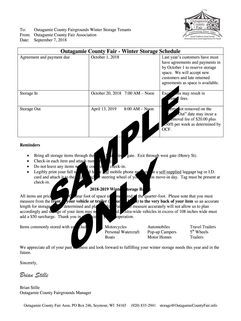 To: Outage County Fairgrounds Winter Storage Tenants From: Outage County Fair Association Date: September 7, 2018Outagamie County Fair Winter Storage Schedule Agreement and payment due October 1,
