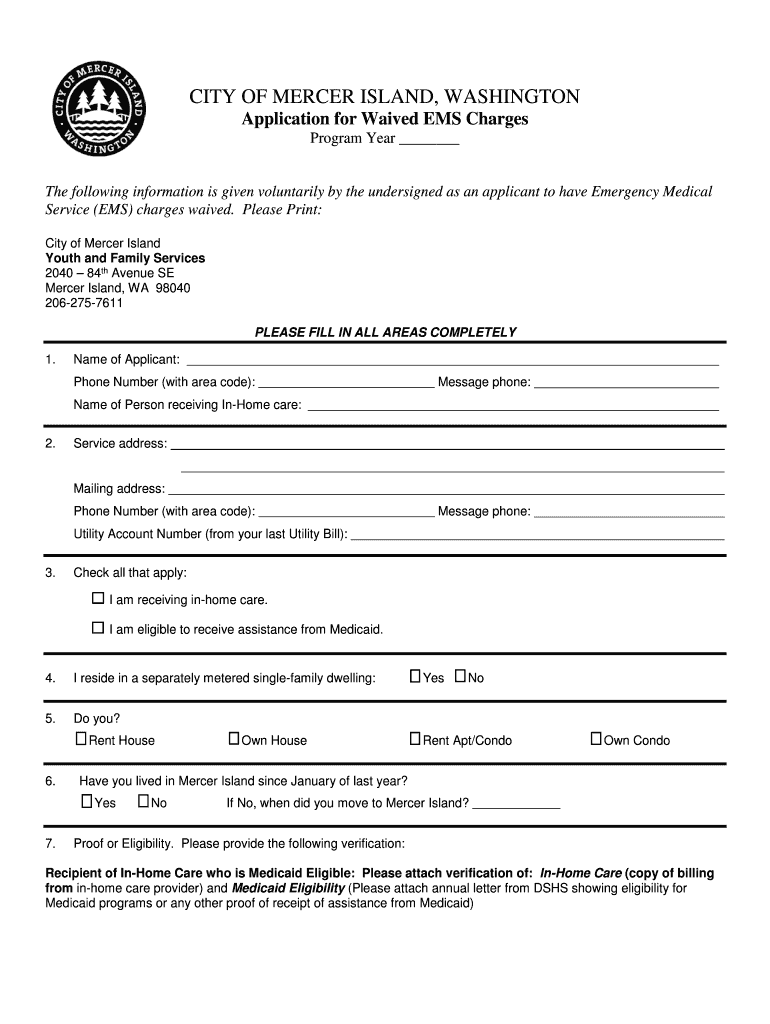 CITY OF MERCER ISLAND, WASHINGTON Application for Waived EMS Charges Program Year The following information is given voluntarily by the undersigned as an applicant to have Emergency Medical Service