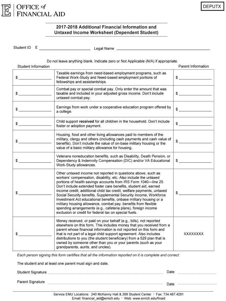 DEPUTX20172018 Additional Financial Information and Untamed Income Worksheet (Dependent Student) Student Illegal Named not leave anything blank. Indicate zero or Not Applicable (N/A) if appropriate.