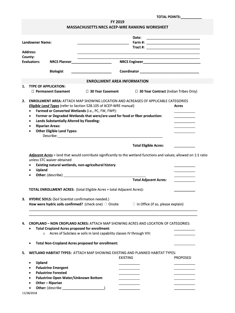 TOTAL POINTS: FY 2019 MASSACHUSETTS ARCS PREPARE RANKING WORKSHEETDate: Farm #: Tract #: ARCS Planner ARCS Engineer Landowner Name: Address: County: Evaluators:Biologist Coordinator ENROLLMENT AREA