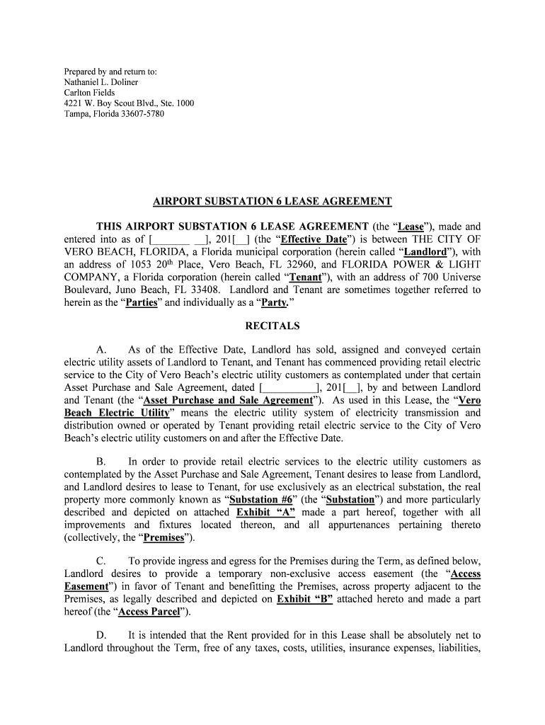 Prepared by and return to: Nathaniel L. Do liner Carlton Fields 4221 W. Boy Scout Blvd., Ste. 1000 Tampa, Florida 336075780AIRPORT SUBSTATION 6 LEASE AGREEMENT THIS AIRPORT SUBSTATION 6 LEASE AGREEMENT
