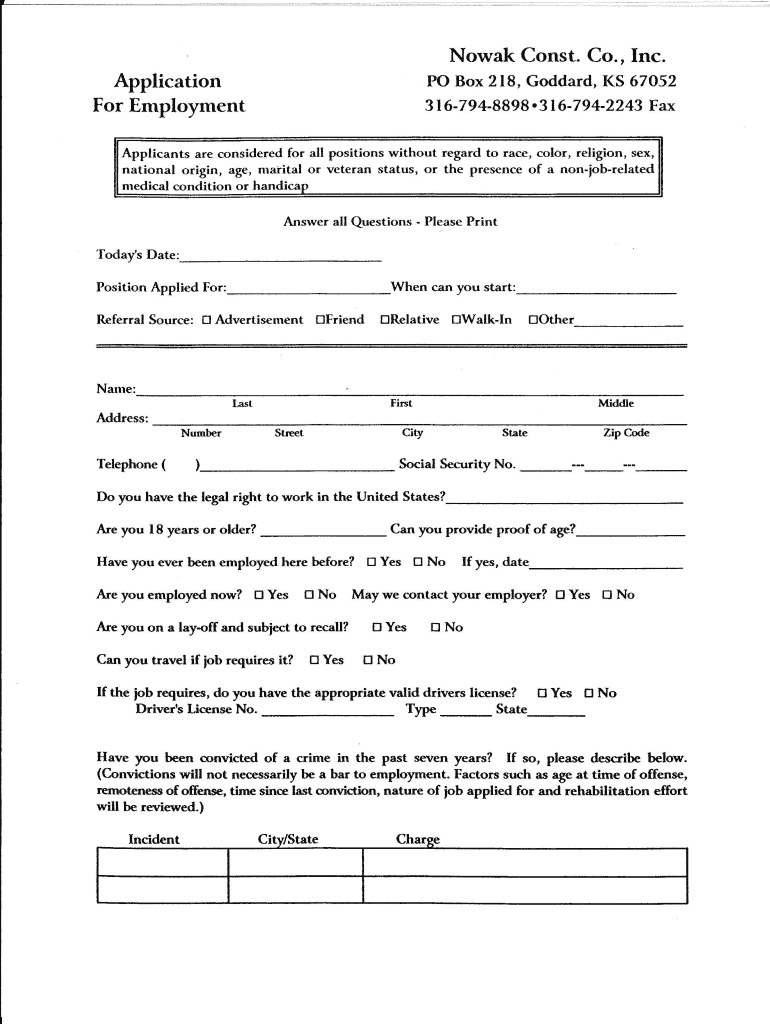 Noway Coast. Co., Inc. Application For Employment PO Box 218, Goddard, 1’S 67052 3 67 948898. 3 67 9 42243FaxApplicants are considered for all positions without regard to race, color, religion,