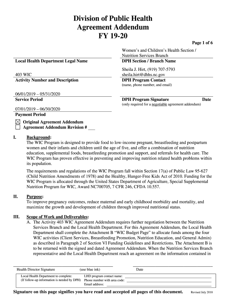 Division of Public Health Agreement Addendum FY 1920-Page 1 of 6Local Health Department Legal NameWomens and Children's Health Section / Nutrition Services Branch DPH Section / Branch Name403 WIC