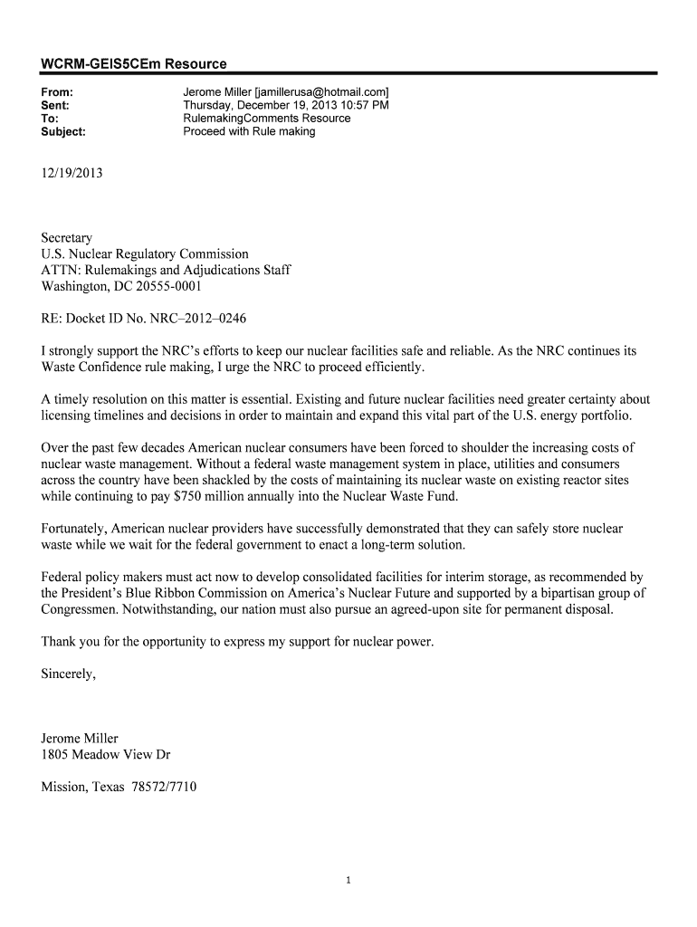 WCRMGEIS5CEm Resource From: Sent: To: Subject:Jerome Miller jamillerusa hotmail.com Thursday, December 19, 2013 10:57 PM RulemakingComments Resource Proceed with Rule making12/19/2013Secretary U.S.