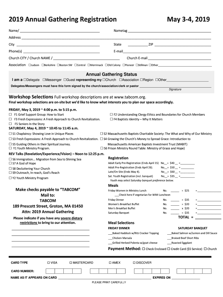2019 Annual Gathering Registration Name/ May 34, 2019Nametag Address City Telephone(s) Email Church CITY / Church NAME / Association ZIP Church Email Judson Berkshire Boston SW Central Merrimack Old