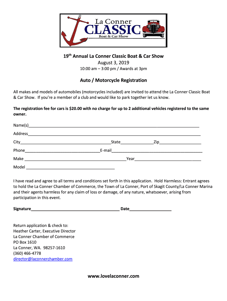19th Annual La Conner Classic Boat & Car Show August 3, 2019 10:00 am 3:00 pm / Awards at 3pmAuto / Motorcycle Registration All makes and models of automobiles (motorcycles included) are invited to