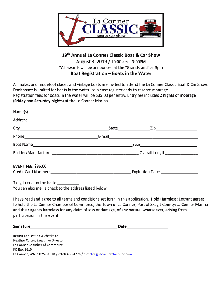 19th Annual La Conner Classic Boat & Car Show August 3, 2019 / 10:00 am 3:00PM *All awards will be announced at the Grandstand at 3pmBoat Registration Boats in the Water All makes and models of classic