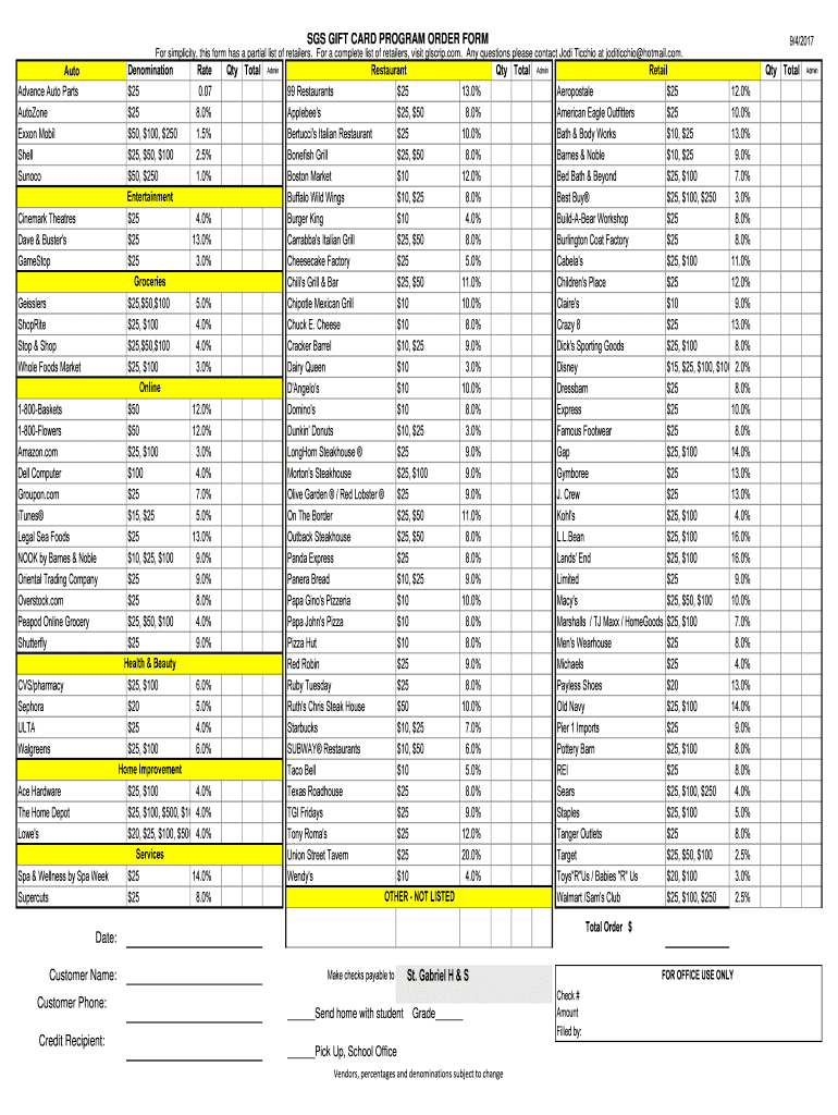 SGS GIFT CARD PROGRAM ORDER FORM9/4/2017For simplicity, this form has a partial list of retailers. For a complete list of retailers, visit glscrip.com. Any questions please contact Jodi Techno at
