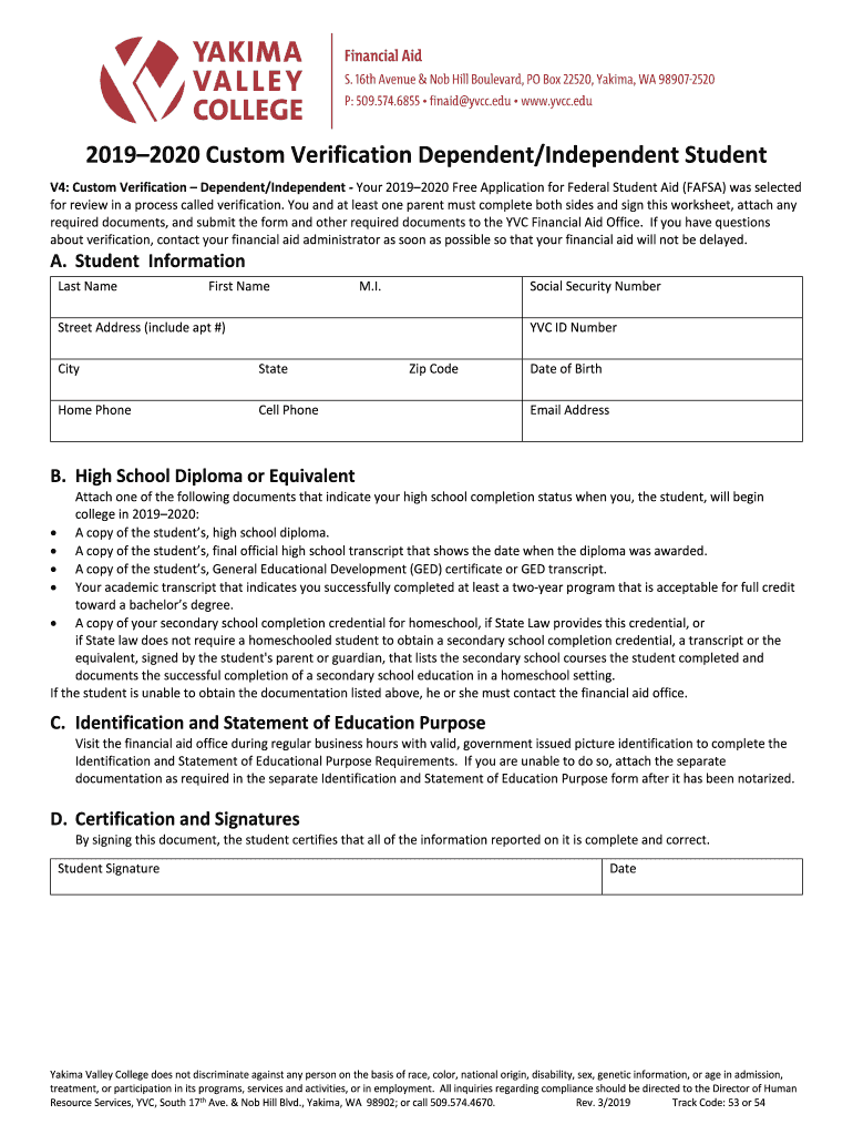 Students who have been selected for verification by the financial aid office and who wish to receive federal or state financial aid are required to file the Yakima Valley College Custom Verification Dependent/Independent Student form.