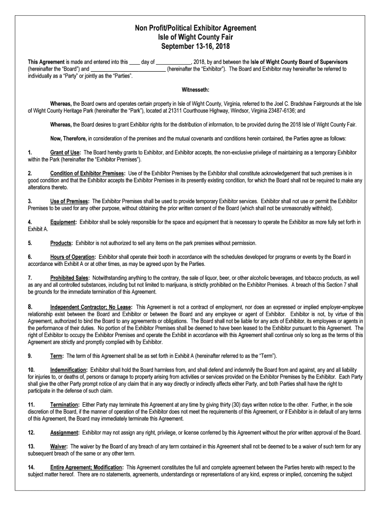 Non Profit/Political Exhibitor Agreement Isle of Wight County Fair September 1316, 2018 This Agreement is made and entered into this day of, 2018, by and between the Isle of Wight County Board of