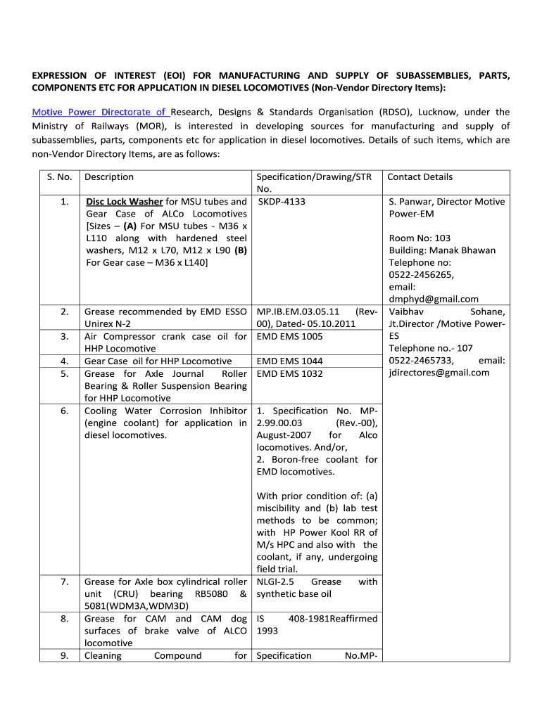 EXPRESSION OF INTEREST (EOI) FOR MANUFACTURING AND SUPPLY OF SUBASSEMBLIES, PARTS, COMPONENTSETCFORAPPLICATIONINDIESELLOCOMOTIVES(NonVendorDirectoryItems): Motive Power Directorate of Research, Designs