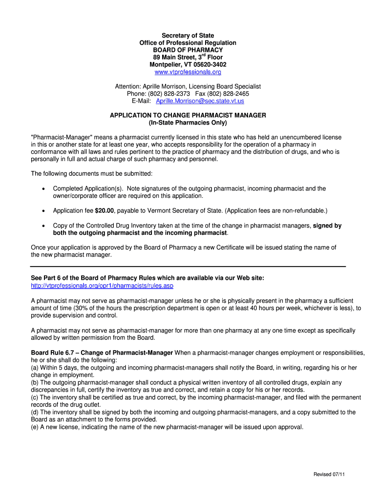Get the free Non-Resident Change in Pharmacist in Charge Application - Vermont ...