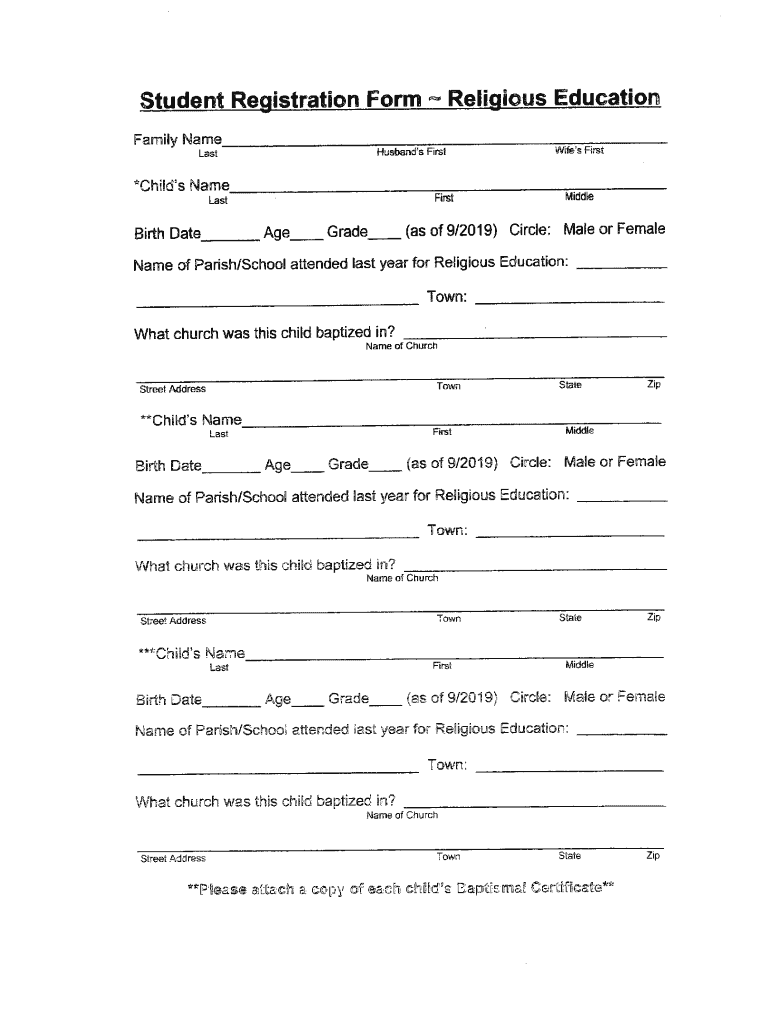 Student Registration Form Religious Education Family Name LastHusband's Fishwife's First×Child's Name Middle e Birth Date. Age Grade (as of 9/2019) Circle: Male or Female Name of Parish/School attended