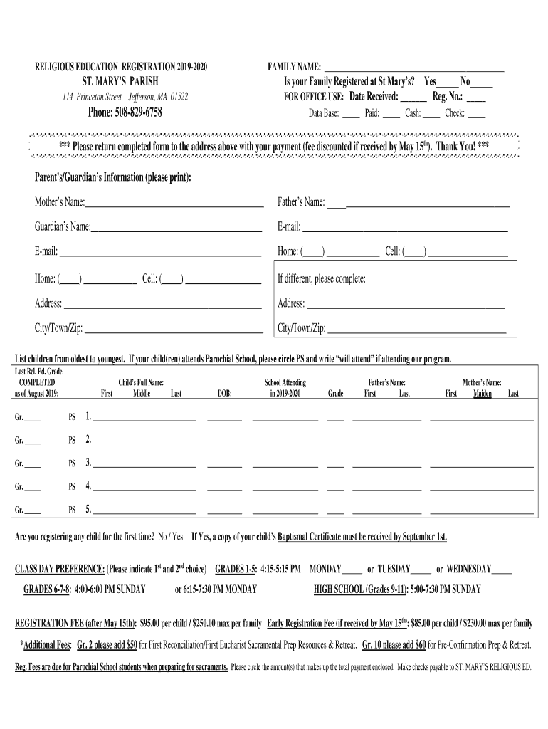 RELIGIOUS EDUCATION REGISTRATION 20192020FAMILY NAME: ST. MARY PARISH 114 Princeton Streets your Family Registered at St Mary's? Yes No FOR OFFICE USE: Date Received: Reg. No.: Jefferson, MA 01522Phone: