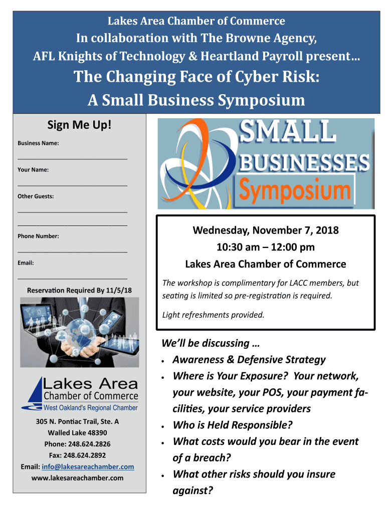 Lakes Area Chamber of Commerce In collaboration with The Browne Agency, AFL Knights of Technology & Heartland Payroll present Changing Face of Cyber Risk: A Small Business Symposium Sign Me Up! Business