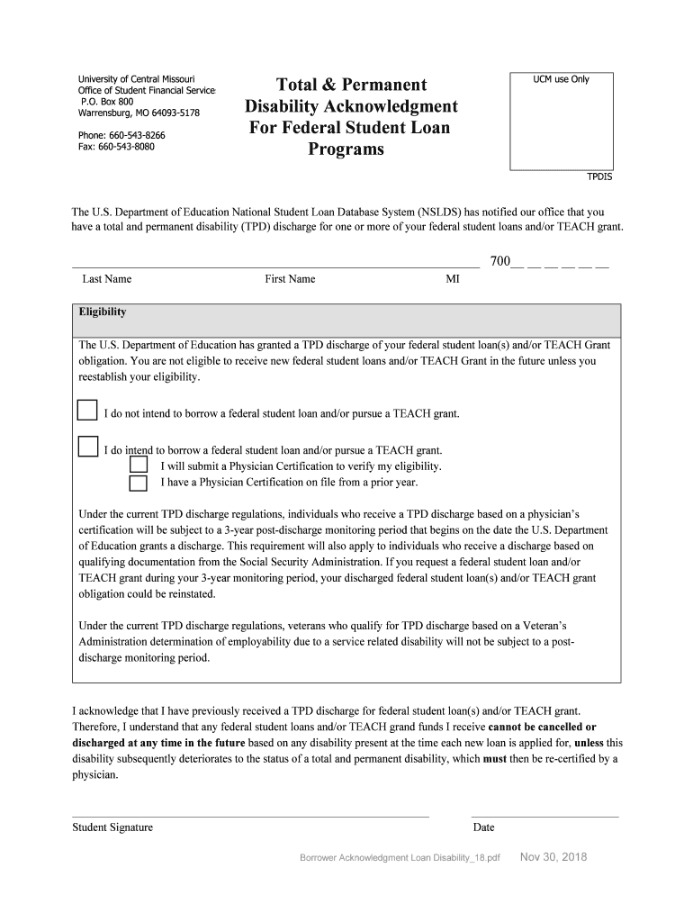 University of Central Missouri Office of Student Financial Services P.O. Box 800 Warrens burg, MO 640935178 Phone: 6605438266 Fax: 6605438080Total & Permanent Disability Acknowledgment For Federal