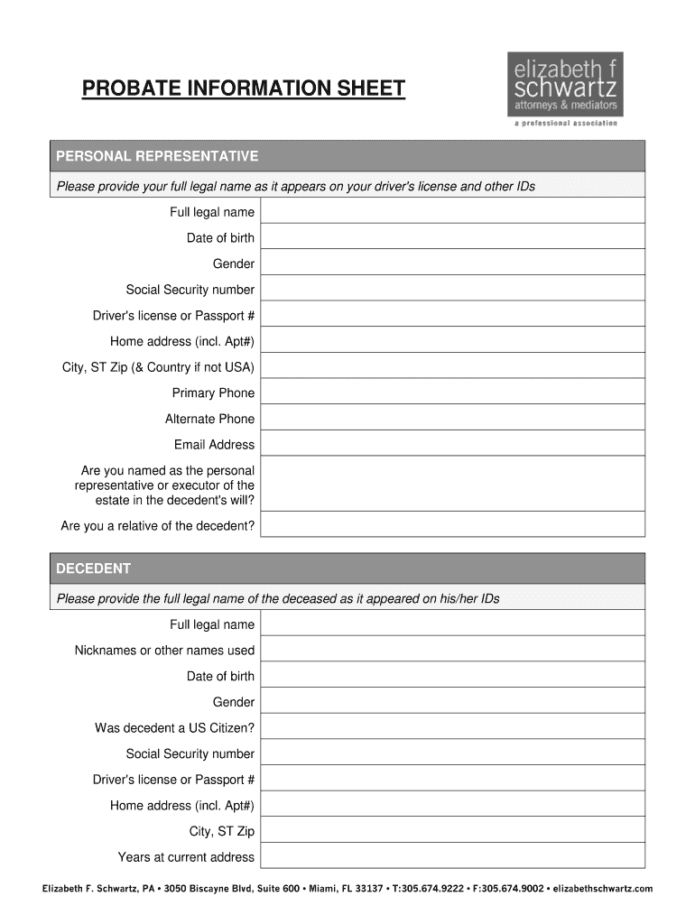 Get the free probate information sheet - elizabeth f. schwartz, pa