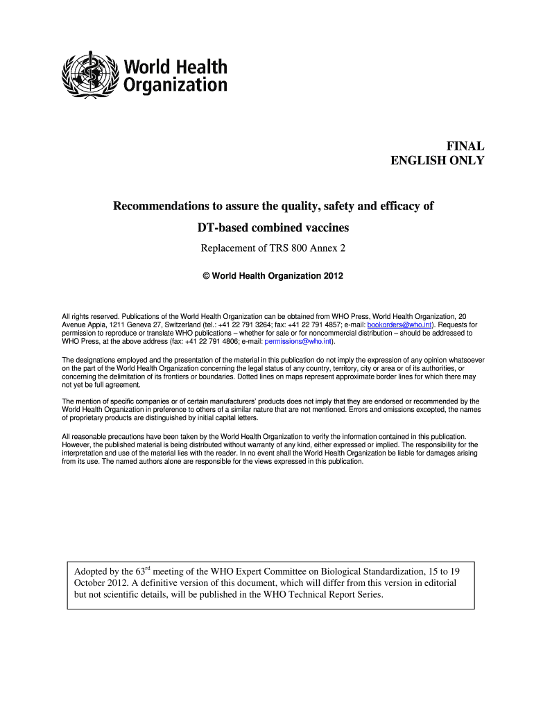 FINAL ENGLISH ONLYRecommendations to assure the quality, safety and efficacy of Debased combined vaccines Replacement of TRS 800 Annex 2 World Health Organization 2012All rights reserved. Publications