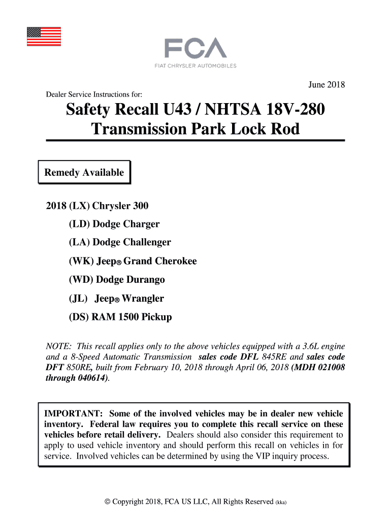 Dealer Service Instructions for:Safety Recall U43 / NHTSA 18V280