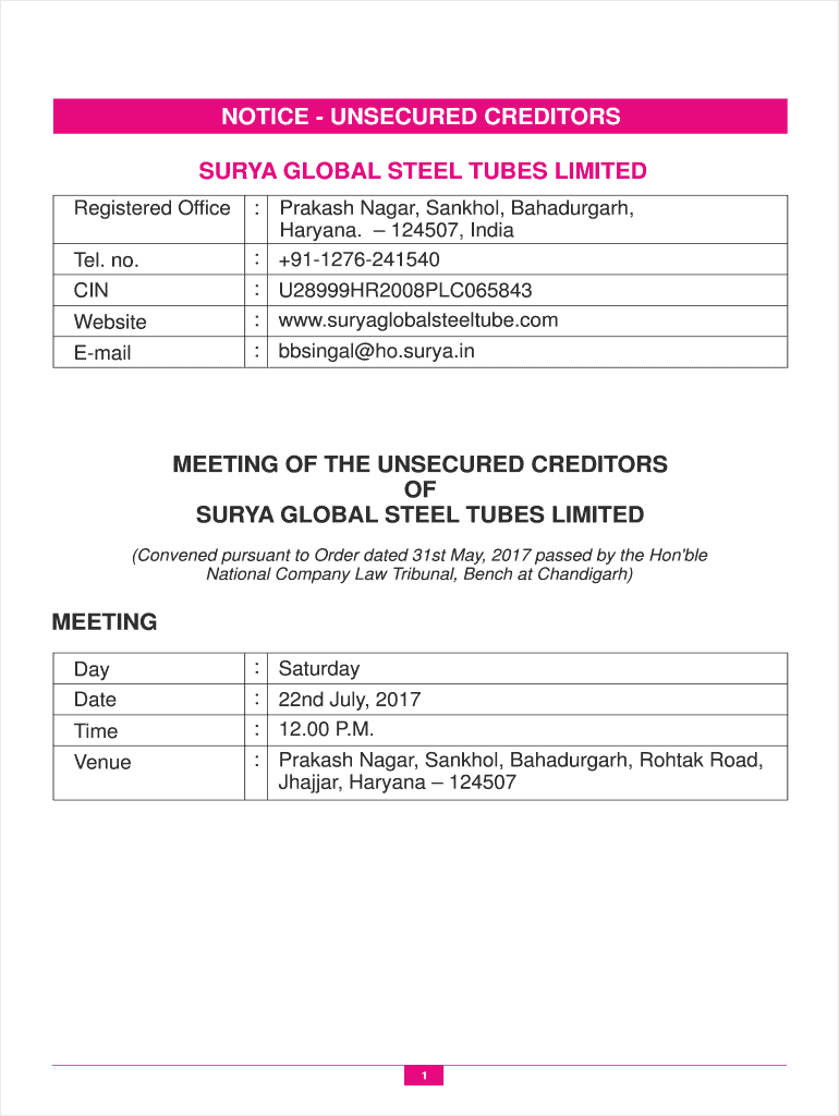 NOTICE UNSECURED CREDITORS SURYA GLOBAL STEEL TUBES LIMITED Registered Office: Prakash Nagar, Sancho, Bahadurgarh, Haryana. 124507, India : +911276241540 : U28999HR2008PLC065843Website: www.suryaglobalsteeltube.comEmail: