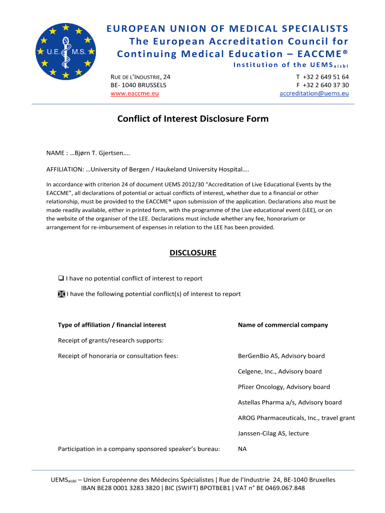 Get the free form 2 - COI disclosure Gjertsen ESCCA 2019 Conference.doc