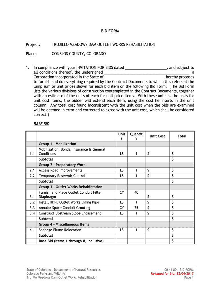 Project:TRUJILLO MEADOWS DAM OUTLET WORKS REHABILITATIONPlace:CONES COUNTY, COLORADO1. In compliance with your INVITATION FOR BIDS dated, and subject to