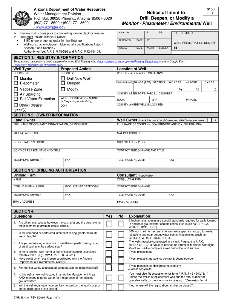 Arizona Department of Water Resources Water Management Division P.O. Box 36020 Phoenix, Arizona 850676020 (602) 7718500 (602) 7718690 www.azwater.gov $150Notice of Intent to FEE Drill, Deepen, or