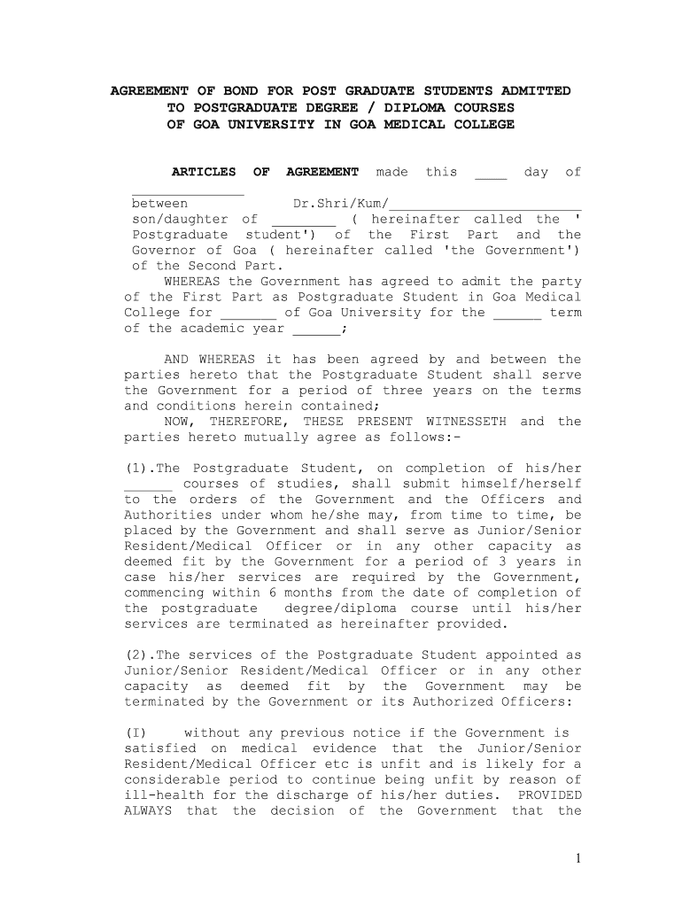 AGREEMENT OF BOND FOR POST GRADUATE STUDENTS ADMITTED TO POSTGRADUATE DEGREE / DIPLOMA COURSES OF GOA UNIVERSITY IN GOA MEDICAL COLLEGE ARTICLES OF AGREEMENT made this day of between Dr. Sari/Km/