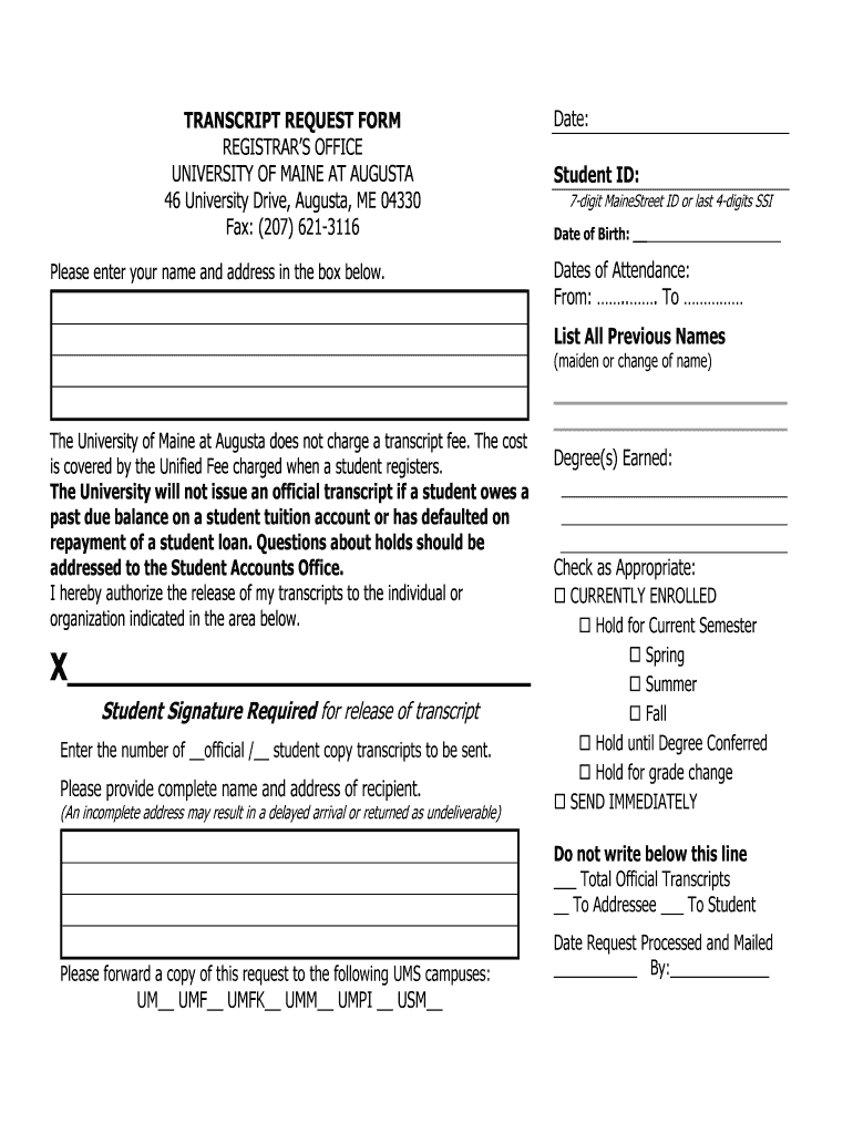 TRANSCRIPT REQUEST FORM REGISTRARS OFFICE UNIVERSITY OF MAINE AT AUGUSTA 46 University Drive, Augusta, ME 04330 Fax: (207) 6213116 Please enter your name and address in the box below. Date: Student
