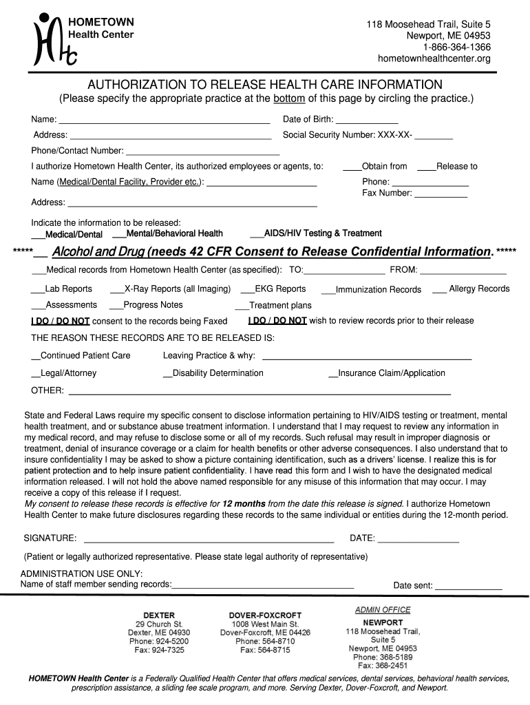 118 Moose head Trail, Suite 5 Newport, ME 04953 18663641366 hometownhealthcenter. Preauthorization TO RELEASE HEALTH CARE INFORMATION (Please specify the appropriate practice at the bottom of this