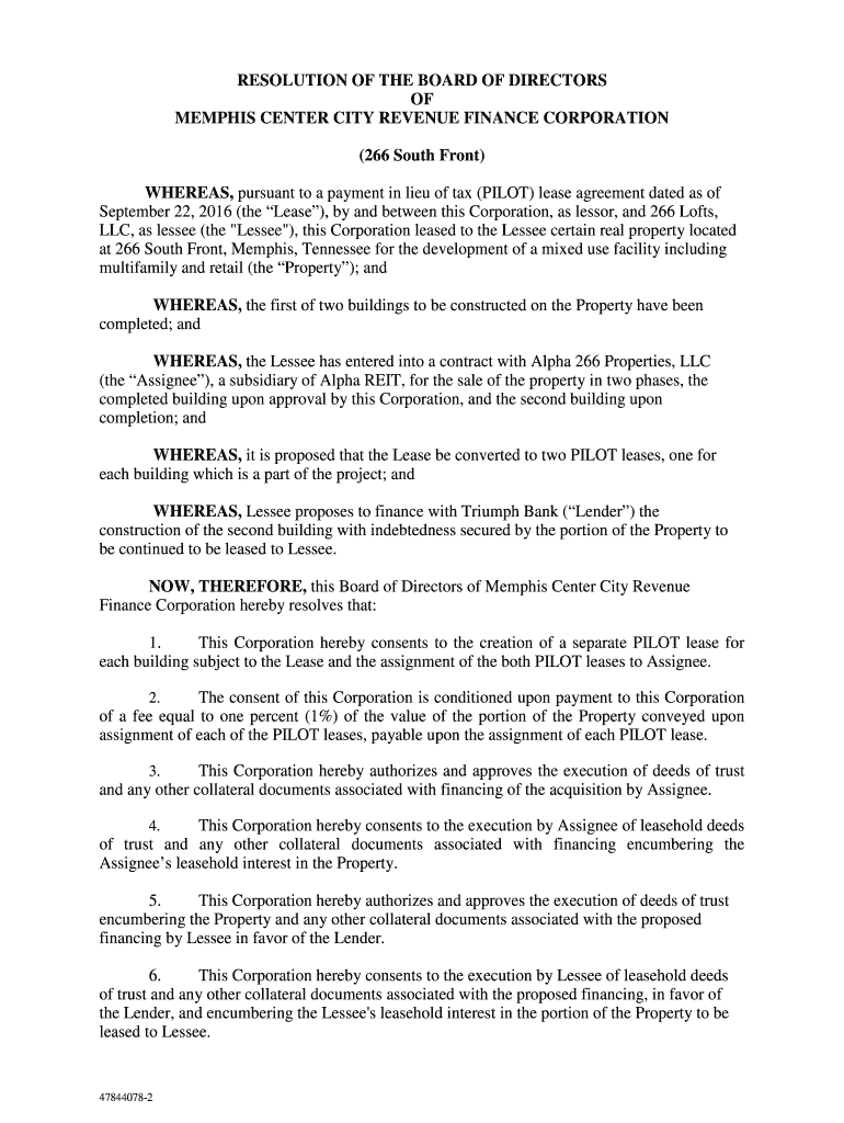 RESOLUTION OF THE BOARD OF DIRECTORS OF MEMPHIS CENTER CITY REVENUE FINANCE CORPORATION (266 South Front) WHEREAS, pursuant to a payment in lieu of tax (PILOT) lease agreement dated as of September