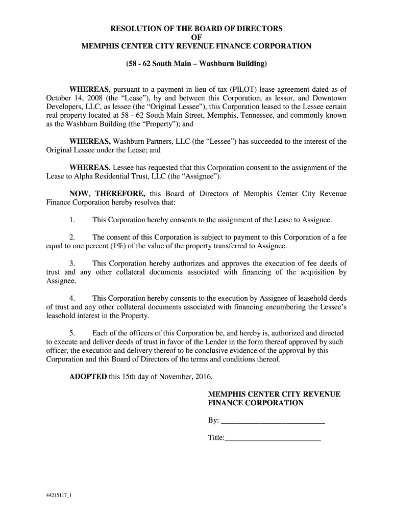RESOLUTION OF THE BOARD OF DIRECTORS OF MEMPHIS CENTER CITY REVENUE FINANCE CORPORATION (58 62 South Main Washburn Building) WHEREAS, pursuant to a payment in lieu of tax (PILOT) lease agreement dated