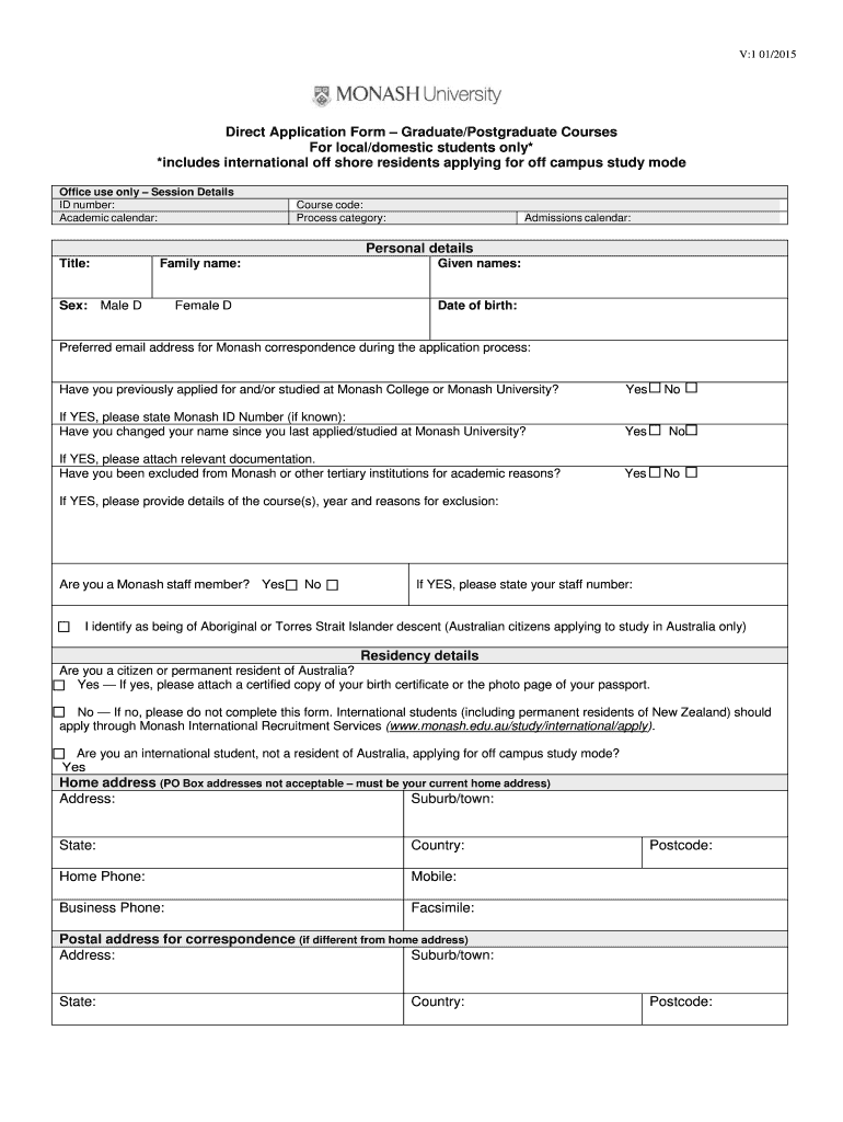 V:1 01/2015 Direct Application Form Graduate/Postgraduate Courses For local/domestic students only* *includes international offshore residents applying for off campus study mode Office use only Session