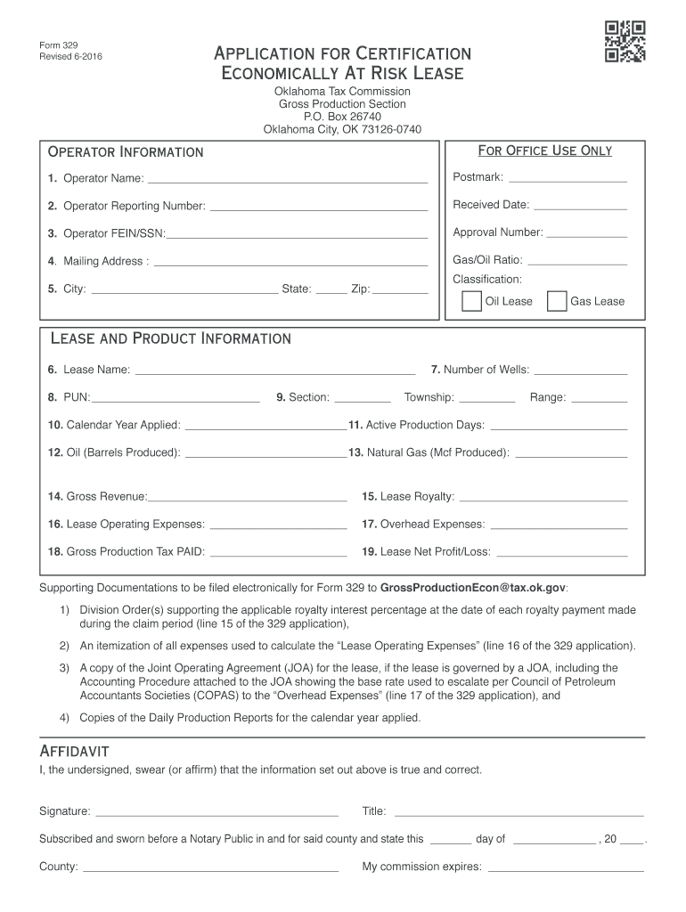 Form 329 Revised 62016Application for Certification Economically At Risk Lease Oklahoma Tax Commission Gross Production Section P.O. Box 26740 Oklahoma City, OK 731260740For Office Use OnlyOperator