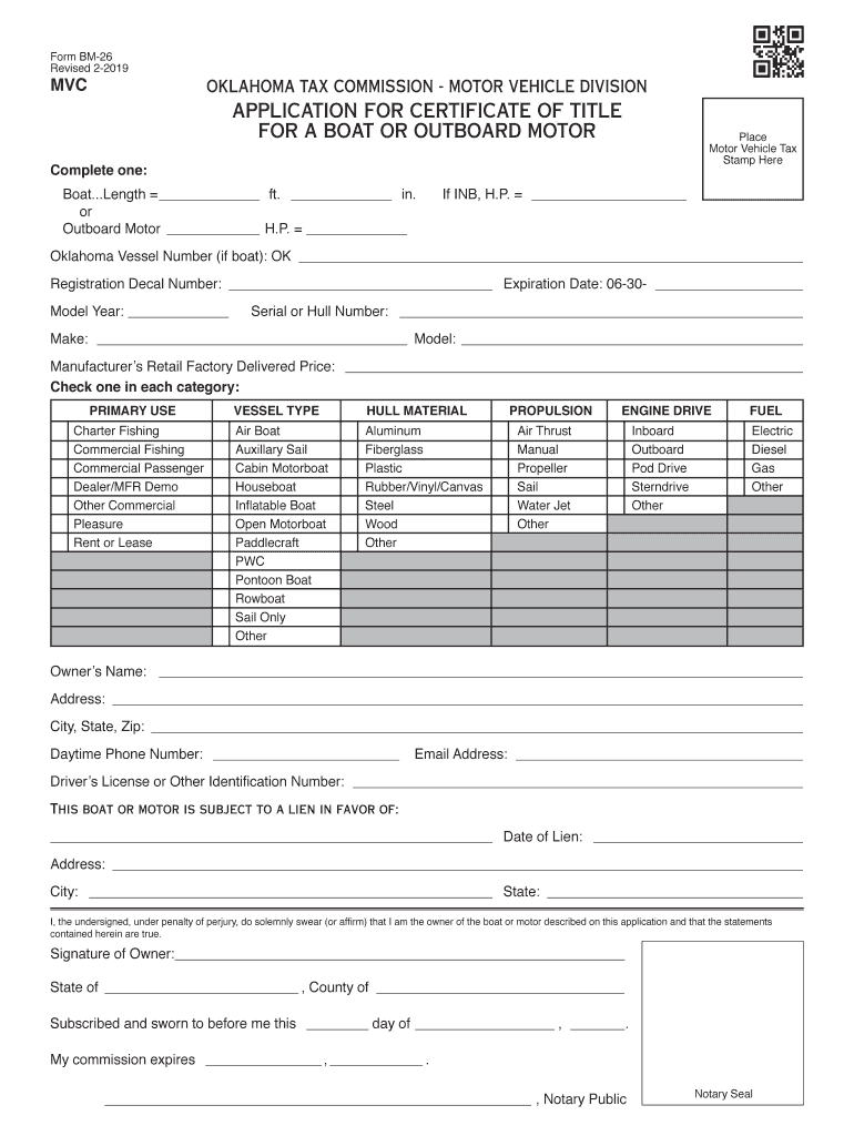 Form BM26 Revised 22019MVCOKLAHOMA TAX COMMISSION MOTOR VEHICLE DIVISIONALIZATION FOR CERTIFICATE OF TITLE FOR A BOAT OR OUTBOARD Monoplane Motor Vehicle Tax Stamp Incomplete one:Boat... Length ft.