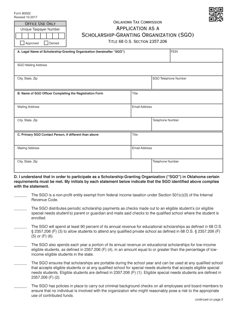 Get the free Application as a Scholarship-Granting Organization ... - OK.gov