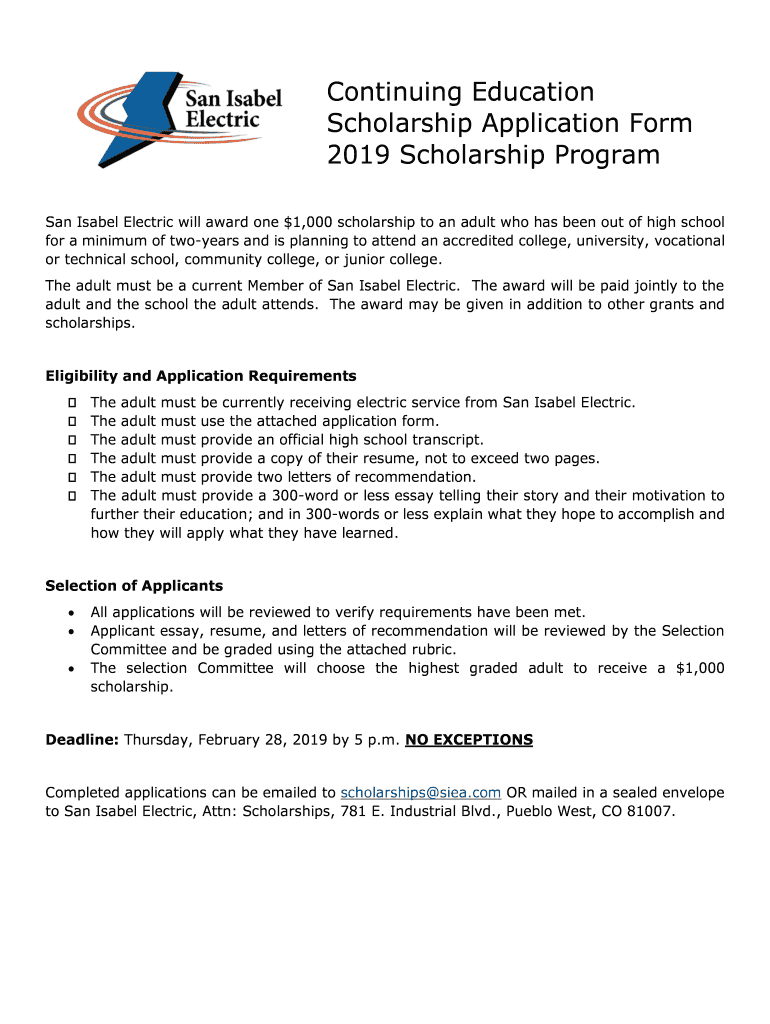 San Isabel Electric will award one $1,000 scholarship to an adult who has been out of high school