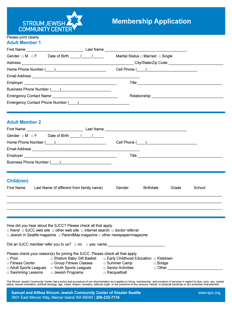 Membership Application Please print clearly. Adult Member 1 First Name Last Name Gender MF Date of Birth / / Marital Status Married SingleAddress City/State/Zip Code Home Phone Number () Cell Phone