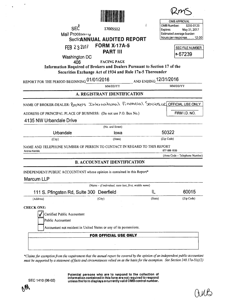 Qm5 OMB APPROVAL OMB Number: 32350123 Expires: May 31, 2017, Estimated average burden hours per response...... 12.00f SEC:17005512Mail Price “i.0 Semiannual AUDITED REPORT FEB 23 ZU11 FORM X17A5