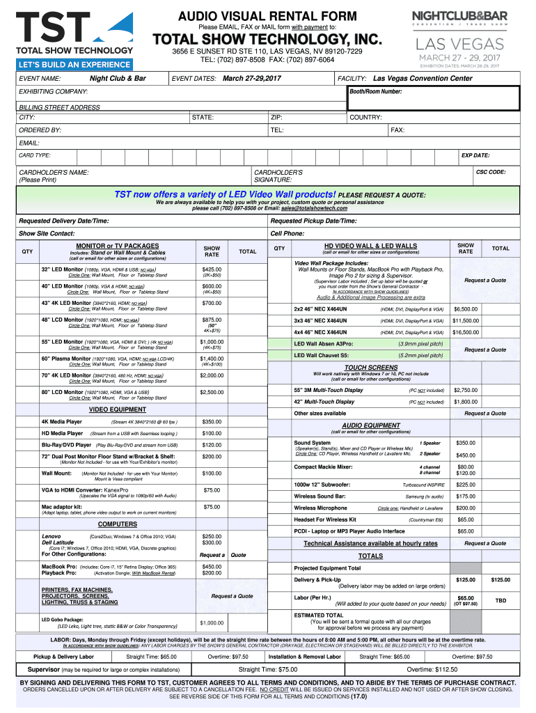 AUDIO VISUAL RENTAL FORM Please EMAIL, FAX or MAIL form with payment to:3656 E SUNSET RD STE 110, LAS VEGAS, NV 891207229 TEL: (702) 8978508 FAX: (702) 8976064 Night Club & Prevent NAME:EVENT DATES:March
