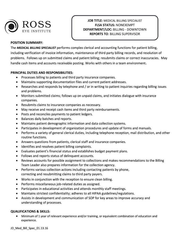 JOB TITLE: MEDICAL BILLING SPECIALIST FLEA STATUS: NONEXEMPT DEPARTMENT/LOC: BILLING DOWNTOWN REPORTS TO: BILLING SUPERVISOR POSITION SUMMARY: The MEDICAL BILLING SPECIALIST performs complex clerical