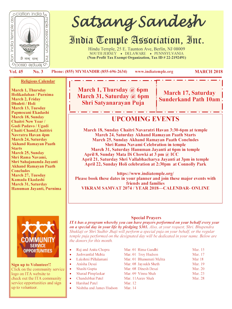 Sat sang Andes India Temple Association, Inc. Hindu Temple, 25 E. Taunton Ave, Berlin, NJ 08009SOUTH JERSEY DELAWARE PENNSYLVANIA (Nonprofit Tax Exempt Organization, Tax ID # 222192491)Vol. 45No.