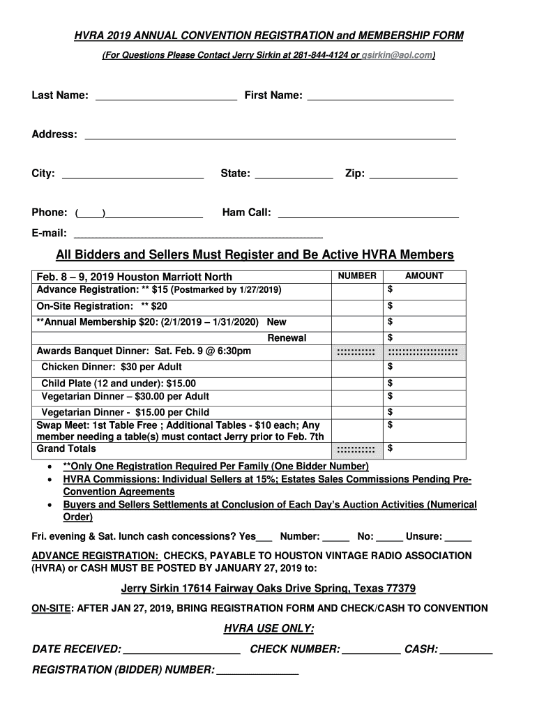HERA 2019 ANNUAL CONVENTION REGISTRATION and MEMBERSHIP FORM (For Questions Please Contact Jerry Sir kin at 2818444124 or gherkin aol.com)Last Name: First Name: Address: City: State: Zip: Phone: ()